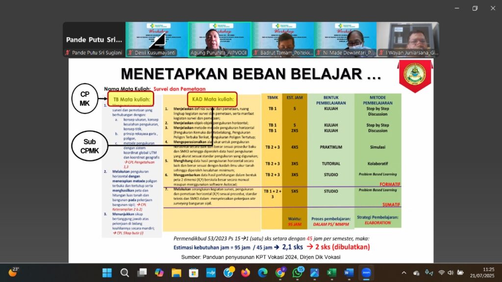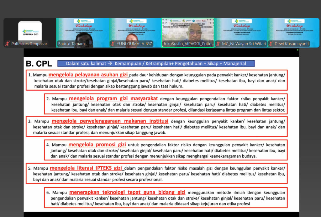 Denpasar, 21–22 Juli 2025 – Jurusan Gizi Poltekkes Kemenkes Denpasar sukses menyelenggarakan Workshop Kurikulum Gizi Berbasis Outcome-Based Education (OBE) dengan Sentra Unggulan Pendidikan (SUP). Kegiatan ini berlangsung secara daring selama dua hari dan diikuti oleh dosen serta tenaga pendidik dari Program Studi Gizi Diploma Tiga dan Program Studi Gizi dan Dietetika Program Sarjana Terapan.